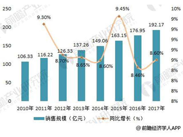 前瞻產業研究院發布的《2018-2023年中國低壓配電柜行業發展前景與投資預測分析報告》數據顯示,2010-2017年,我國低壓配電柜行業銷售額增長基本維持在8.4%以上。近兩年,由于宏觀經濟進入新常態、電力投資增速不斷放緩等影響,低壓配電柜行業銷售規模增長較為穩定。2017年,低壓配電柜市場銷售規模約為192.17億元,同比增長8.60%,僅較2016年提高了0.14個百分點。