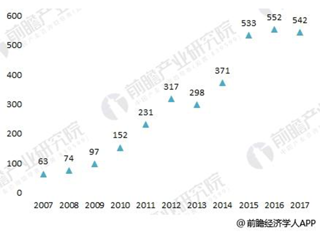 圖表3:2007-2017年低壓配電柜行業相關專利申請數量變化圖(單位:項)