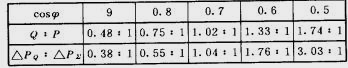 得知當電網結構固定,輸送的有功功率一定時ΔP∑的大小取決于Q的變化,即與Q的平方成正比。下面的表格表示了不同負荷